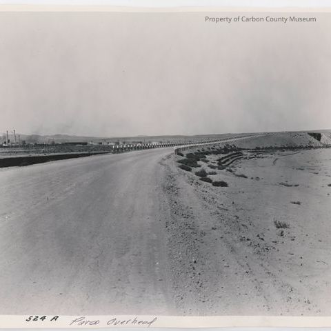 Update - March 2010: Black & white print of highway over a railroad track. Guard rails along sides of road as it proceeds up & over track. Posts are dark at the bottom & white at the top. The refinery is on photo left, smoke stacks, tanks & buildings can be seen.
