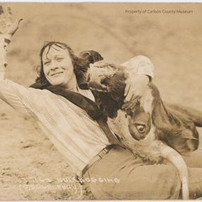 Sepia print card of a woman sitting on the ground with her left arm around the neck of a steer & her right held in the air. The steer's head is upside down with a horn to the ground on the outside of the lady's right thigh. She has long dark hair, wears a long sleeve striped shirt, pants with buttons at the knee & boots. Her raised hand has dirt in the . Written at the bottom in white: "Fox Hastings, Bulldogging (double day)":