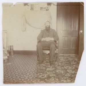 Update - 2009: Sepia print. Image of a bearded man. Seated in a chair inside a room. Man is dressed in dark clothes & has his hands clasped over his stomach. Chair is wooden with small wheels on bottom of legs & appears to have an upholstered seat. Room has two different patterned floor coverings. Fabric draped shelf with clock & photos on wall behind man. Two doors at right - one is back wall & one to right with edge & door knob visible.