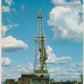 Printed on back with brown ink: "Drilling rig" "Typical of present day drilling scenes is this tall steel derrick used by oil companies in the search for more oil for industry: "Color Photo by Bishop" "Address" "Place Stamp Here" Down the middle: "Mirro-Krome Card by H. s. Crocker Co., Inc., San Francisco, Calif."