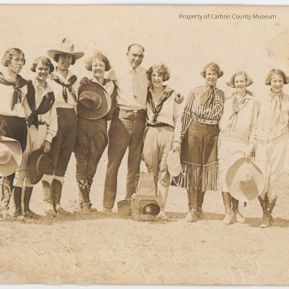 Sepia print card of eight women and one man. They are standing in a line with the man in the middle. Women are dressed in cowgirl attire, scarves, large hats, fringe & boots. All but one wears pants. One woman has a hat on her head, the others hold them in their hands. The man wears long sleeve, light colored shirt, dark slacks & tie. A large box camera sits at his feet. he does not wear a hat & his hair line is receding.