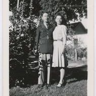 Update - 2009: Black & white print. Snapshot. Image of a man & woman posed on a lawn in front of flowers & tree. House in background. Man is in uniform - light-colored slacks & dark belted jacket. Woman is wearing light-colored dress with pleated knee-length skirt & 3/4 sleeves; she has dark shoes with ankle straps; her hair is pinned up.