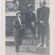 Update - 2009: Black & white print. Snapshot. Image of a man & two women posed on the steps of a brick building. Man is standing next to steps at left resting his left arm on the top step. He is wearing a dark suit, white shirt, patterned tie and hat. Woman at center is seated on top step. She is wearing a patterned dress, long dark coat with flower on left shoulder & dark hat with light flowers on top. Young woman is standing on the second step (from bottom); she is wearing a patterned dress, long dark coat & white shoes.