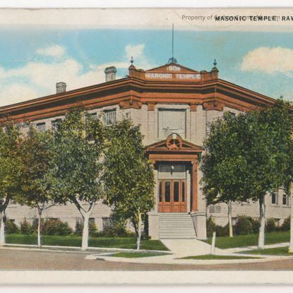 Update July 2011: Color print on postcard paper of a multi level stone building surround by trees. A sidewalk leads from the street to a corner door. Steps with side abutments rise to double doors & windows. Doors, pillars on either side under a small roof & roof edge trim are colored brown. Green leaves are on the trees & sky is blue with white clouds. Across the roof edge at corner: "1908 Masonic Temple, Rawlins, Wyo." Printed in black on top right border: "masonic Temple, Rawlins, Wyo."