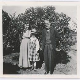 Update - 2009: Black & white print. Snapshot. Image of a man, woman & girl standing in what appears to be an orchard. Man is dressed in dark 3-pc suit, white shirt & dark tie. He has a beard & mustache, short hair & glasses. Girl in center is dressed in a plaid jumper, white long-sleeve shirt, white tights, dark multiple-strap shoes, & wide-brimmed hat. Woman is partially obscured by a tree branch. She is dressed in a light-colored ankle-length skirt & light-colored blouse.