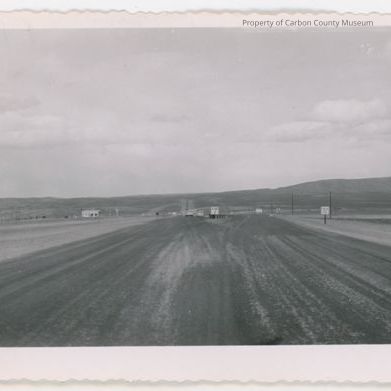 Update - March 2010: Black & white print of Walcott Junction. A wide gravel road in foreground. Signs on right: "Junction 1000 feet" Billboard sign" "Medicine Bow Lodge" On left are buildings, One with a flat roof & sign in front, another white one with high line poles behind. On road in distance are three cars. Photo has scalloped edges.