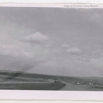Update - March 2010: Black & white print of highway near Walcott Junction. A fence parallels highway on photo left. High line poles & bill board signs are on right. Cars can be seen on highway coming toward photographer. Buildings are in distance. Print has scalloped edges.