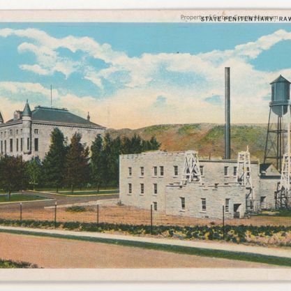 Color print card of two multi level stone buildings. Building on photo left has pointed cone roofs on towers. Building on right has flat roof, a three wood frame tower behind it, more buildings extend beyond. A water tower is on photo right. Trees and landscaped lawn surround the structure on the left. A dirt road & fence are in the foreground. Printed in black on right top border; "State Penitentiary, Rawlins, Wyo."