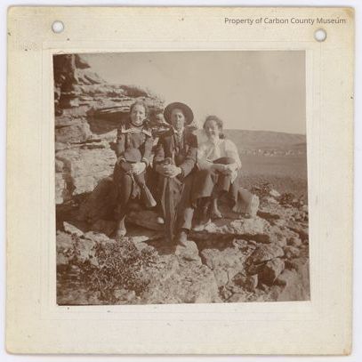 Update - 2009: Black & white print. Snapshot. Mounted on off-white matboard with patterned border & two binding holes at top. Images of a young man and two young women seated at rocks on a rock hill. Prairie and hills in background. Man is wearing a dark suit, white shirt, dark tie & hat. He is holding an umbrella up against his raised right knee. Woman seated on left is wearing a dark sailor dress, dark tights & lace-up boots; her legs are crossed & her hands are clasped over her right knee; her hair is tied in back with a dark bow. Woman seated on right is wearing a dark skirt & white patterned long-sleeve blouse; she has lace-up boots & her hair is tied in back. She is seated with her legs crossed and hands clasped over right knee.