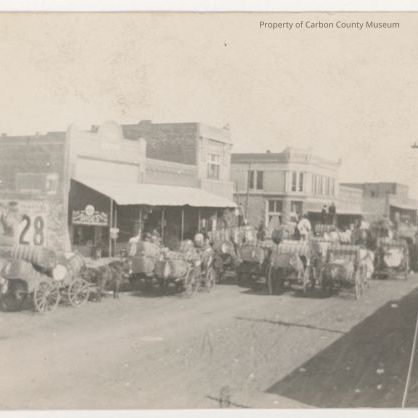 Update July 2011: Black & white print on postcard paper. Image of wagons loaded with bundles of wool. Wagons are on a dirt street headed away from the photographer in 3 & 4 rows. Several men are standing in center of wagons on top of the loads. Multi story buildings are on photo left, A shoe sign is in a window. On the side of the building is a mural of horses & # "28" at each end.