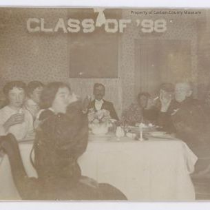 Written on back in blue ink: "Class party Nov 21, 1897 Mazie Irving, Mamie Cronin, Stella Bennett, Prof. Trapp, Mazie Irving, Miss Salmon. I think the party was at Mary (Mazie) Irvings home. One in foreground is Lettie Cannon & standing is Annabel Cannon, aunts of Mazies. Given to Museum by Mrs. Anna France Rawlins, Wyo."