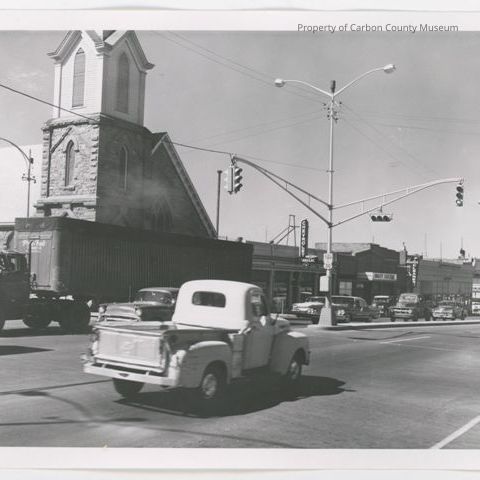Update - 2009: Black & white print of 300 block of Cedar Street. Southwest corner of 3rd and Cedar. The steeple of the presbyterian Church is on the photo left. Cars, pickups, and a semi are traveling on Cedar Street at the traffic light. Traffic is separated by the concrete median with traffic & street lights on median.