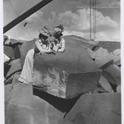 Update - 2009: Black & white copy print. Snapshot. Image of two women leaning against a large slab of rock on pile of large rocks. Women are dressed in long-sleeve, long white dresses & fancy hats.