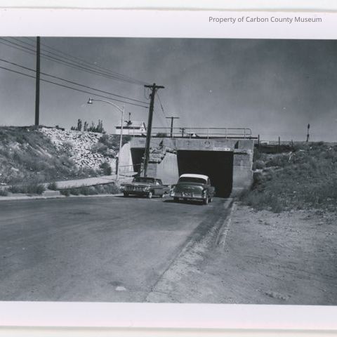 Update - 2009: Black & white print of Washington Street under pass. Street is under railroad tracks. Two cars are on south side, one traveling north & one south. Sign on underpass reads: "Clearance 14' " Also a "Union Pacific Railroad" sign inside symbol. "1951" is engraved in cement above walking lane which parallels driving lane. See also 1999.732.0176.
