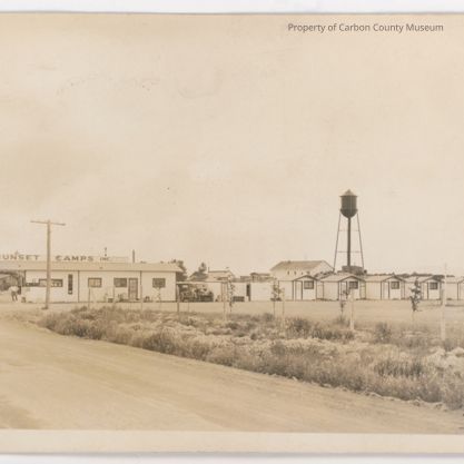 Update 2009: Black and white print of Sunset Camps Inc. office and cabins. There is a multi-story building behind cabins. A tall water tower and tank is behind cabins. Several other structures are visible in background. In the foreground is a row of young trees. There are two vintage cars parked behind office. Men side left background.