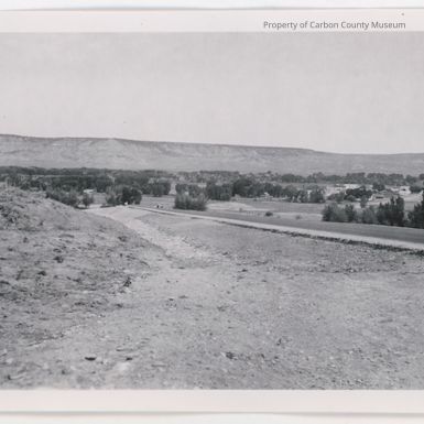 Update 1/2008: Black and white print. Snapshot. Image of an unstriped highway running into a low valley from sagebrush prairie. Trees populate the valley and a small town can be seen in the right midground with the highway turning to run through it. Low hills in the background.
