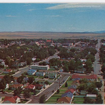 Printed on the back in black: "City of Rawlins, Wyoming from the air. Photo by Laura Dexter. Published by D & G Enterprise, Emblem, Wyoming" "Postcard"