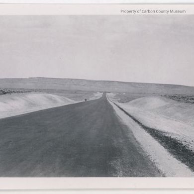 Update 1/2008: Black and white print. Snapshot. Image of an unstriped highway running below grade through a sagebrush prairie. Low hills in the background. Fences on either side in the sagebrush.