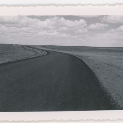 Update 1/2008: Black and white print. Snapshot. Image of an unstriped highway running through prairie. White puffy clouds in sky. Scalloped edges.