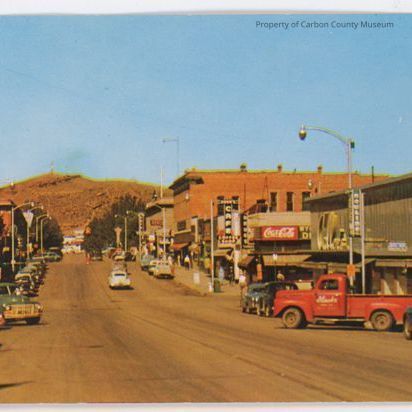 Update July 2011: Color print on post card paper. Image of Cedar Street looking west. Cars & pickup trucks on both sides of the street. In the distance cars are traveling on the street. Vehicles appear to be of the late 40's, early 50's era. Business signs are on the buildings such as Cafes Drug, Hotel & CocaCola.