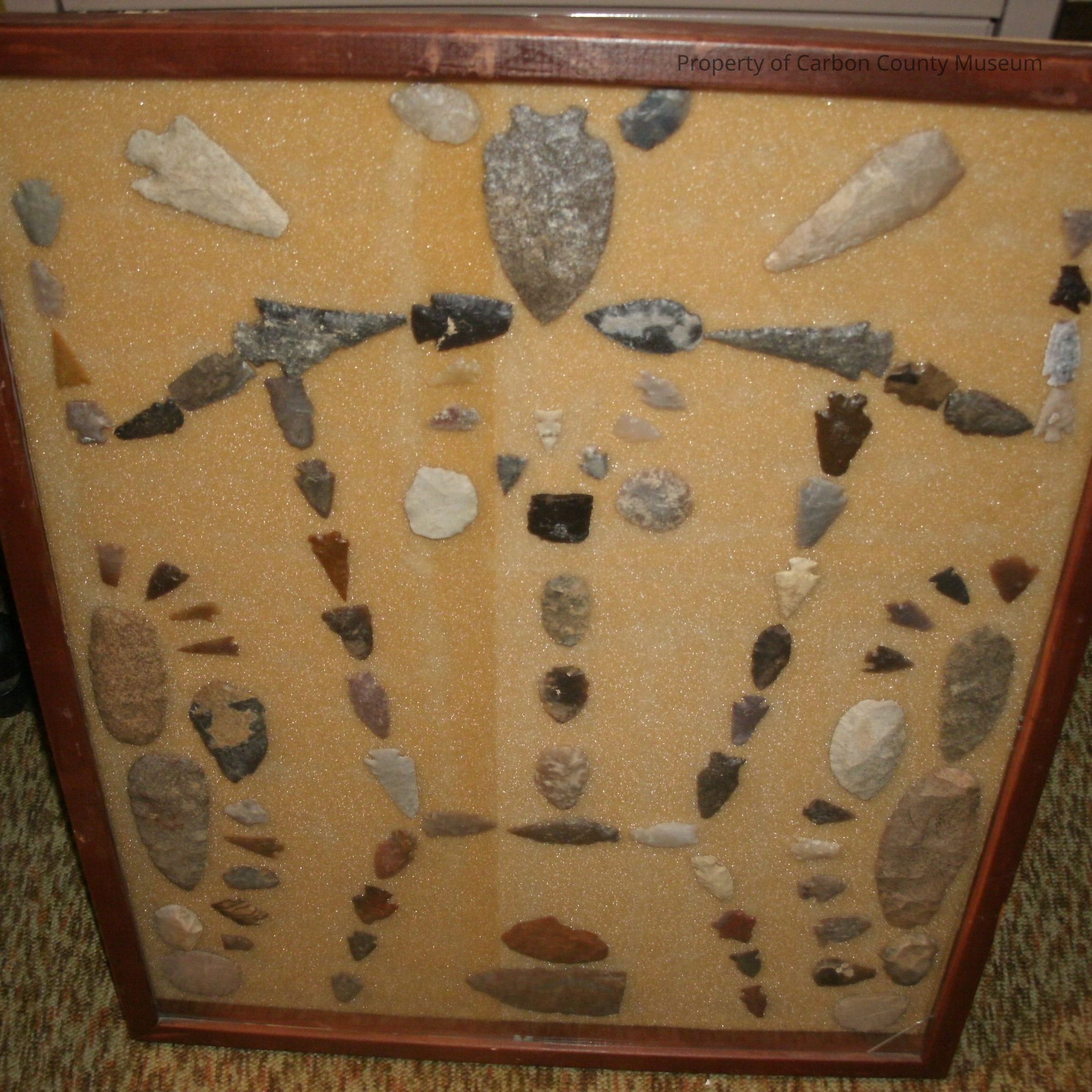 18 1/2 x 22 1/2 wood framed collection of projectile points. Included are large and small points. Some intact and some broken. Different stone colors. A couple of scrapers are included. There are about 84 stones. They are in a man pattern (Fremont Indian) with light tan foam background.Collection