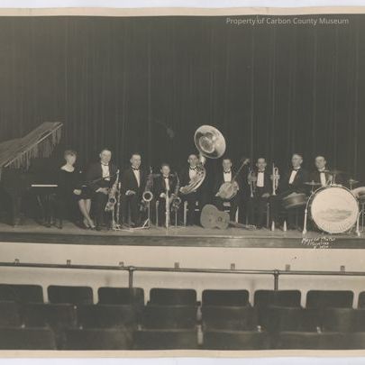 Update 2/2008: Black and white print. Image of a 9 piece brass, string and percussion band posed with their instruments on a stage . Group consists of one woman, seven men and a young boy. Woman is seated on piano bench with piano behind her . She is wearing a long-sleeved knee length black dress and heels. Men and boy are dressed in tuxedos. painted on bass drum: "Sagebrush Syncopators". with mountains and plains painted through center. Auditorium seating in foreground.