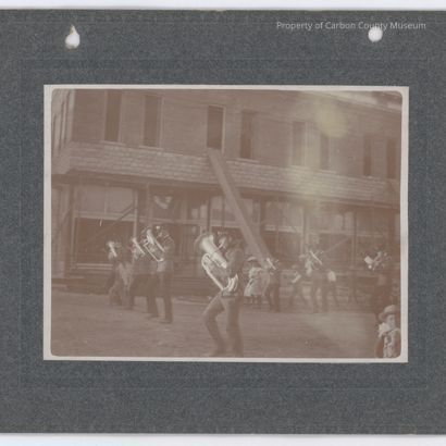Update 2/2008: Sepia print. Snapshot. Mounted on grey matboard with floral border and two binding holes on top edge. Image of a marching band in formation marching down a dirt street. Block of buildings, apparently under renovation or construction in background. Several children are walking/marching along with the band. Sun reflection or photographic anomaly along right side.