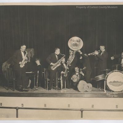 Written on the back in blue ink: "A Rawlins Orchestra about 1922. Amy Whitson at Piano. Carl Lahruman, Lyle Smith (barber at Stookies barbershop) Dewey Turner, Earl Farlwell, Fredic Lara, Walt Hootman, Bill Stookey, small boy i Arron Kramish[.] Given by Mrs. Walton France - Rawlins, Wy."