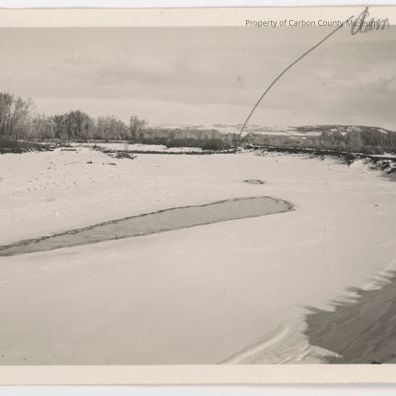 Update 1/2008: Black and white print. Snapshot. Image of a wide snow-covered river channel with a brush dam running across it in the background. Trees and snow-covered hills in the far background. Written in upper right in pencil with pencil line pointing to feature "dam".