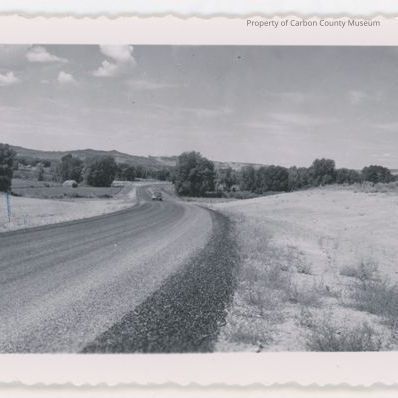 Update 2/2010: Black and white print of gravel road. On photo left are hay stacks Trees are on both sides of the road in the distance. A car is traveling toward photographer on the road.