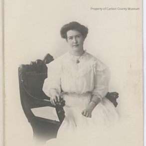 Update 2008: Black and white print, studio portrait. Half length (head to hips) portrait of a young woman wearing a white dress seated in an ornately carved wood chair. Dress has puffed 3/4 sleeves with elastic lace cuffs, pleated bodice with eyelet lace through chest. Young woman is wearing a circular locket around her neck, a hand bracelet and ring. Her hair is pinned up. Appears to have been taken at the same time as 1948.037.0231.
