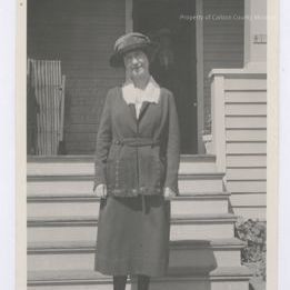 Update 2008: Black and white print, snapshot. Image of a woman dressed in a dark suit, dark hose and shoes, white blouse with wide lacy collar and dark hat standing on the sidewalk in front of wooden porch steps. Wood frame house behind her with house number partially visible "30". An expandable gate can be seen on the porch at left and there appears to be another woman standing inside the door at center background.
