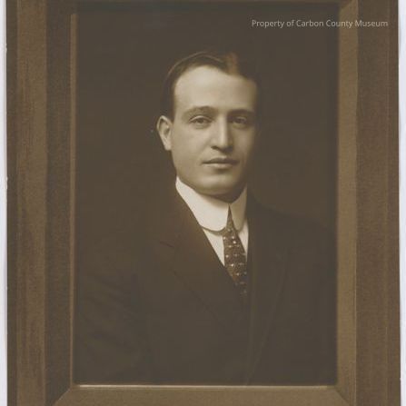 Update 2008: Sepia print. Studio portrait, head and shoulders, of a young man dressed in a dark suit, patterned tie and white shirt. Image of a frame around the edges gives the impression of a painting.