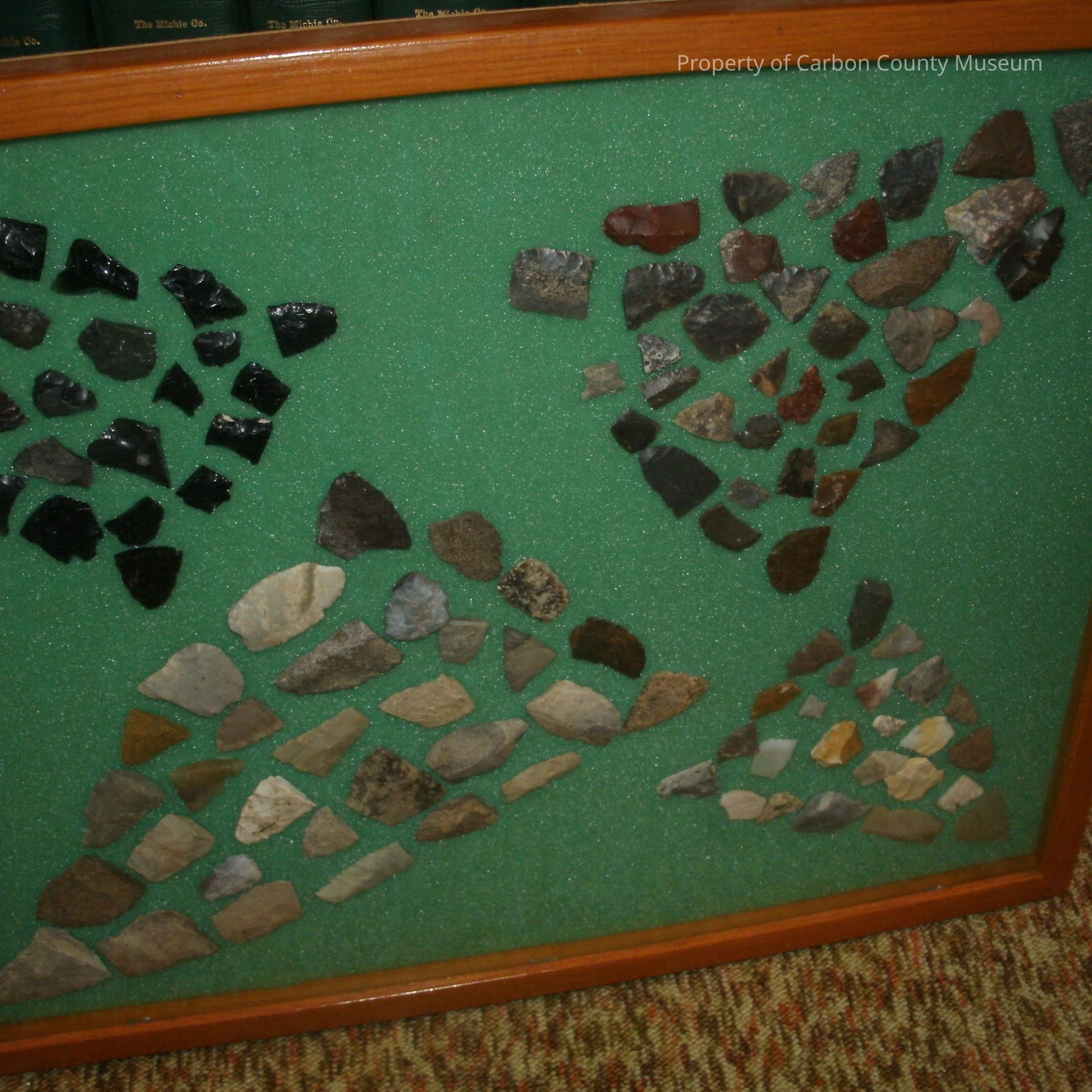 A wood case, 20 1/2 x 17 with glass front and green foam backing with four arrowhead design shaped. Each arrowhead is made up of pieces of points. Top right has 27 black (obsidian) pieces. Top right has 37 reddish pieces of points. Bottom left is larger pieces and has 31 light brown pieces. Bottom right. is small and has both larger and smaller pieces. There are 24 agate type pieces. Found in Red Desert Wyoming, 1983-84-85 by collector.Collection