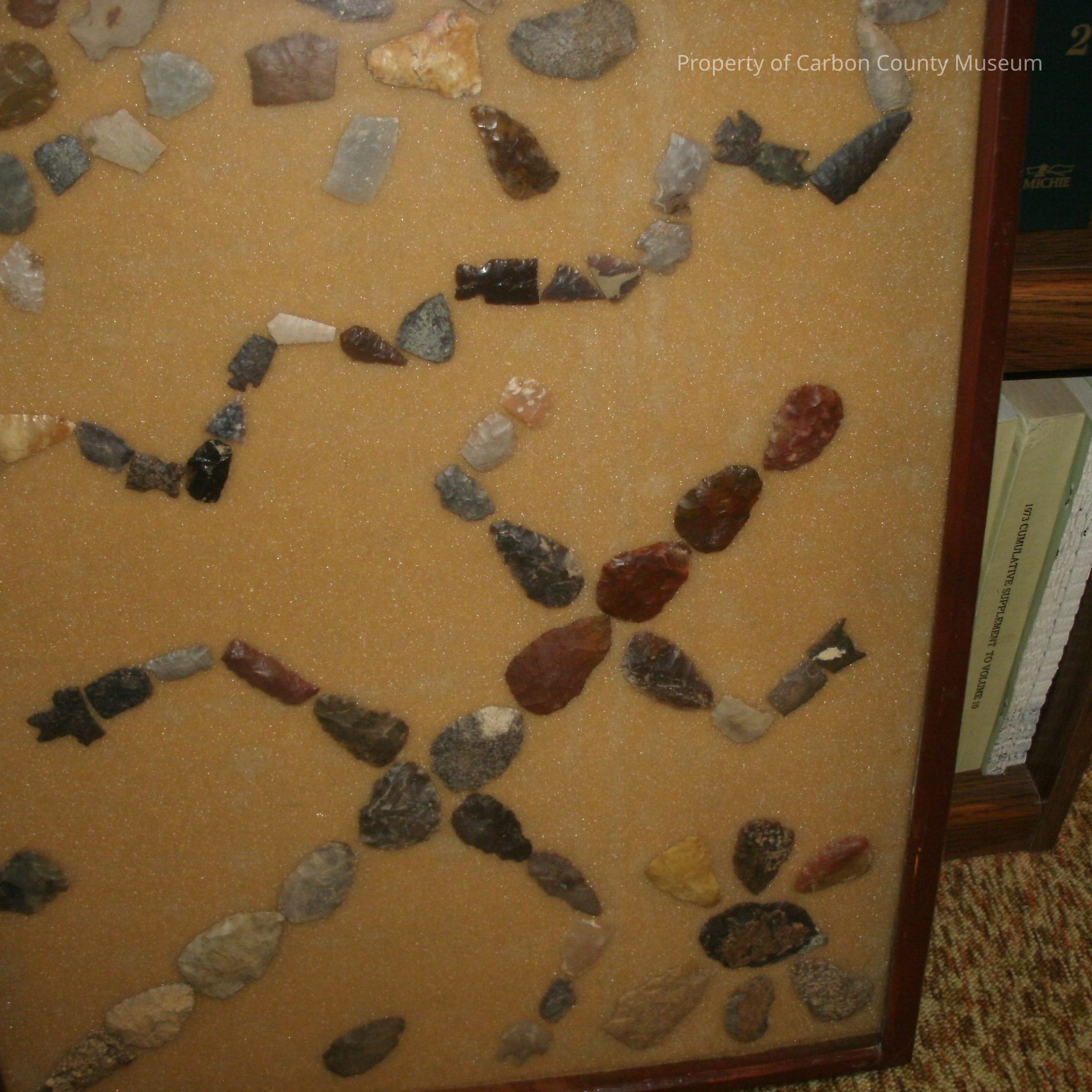 Dark red wood glass front case with tan foam backing containing multiple pieces of points shaped into a lizard and snake pattern with three spiders of rocks as well. In top left corner there is a circular spider shape with one larger piece in center and 15 pieces around it. In the top center there is another circular piece (spider shape) with one in the center and 6 pieces around. Below this there is the shape of a snake made with 21 pieces of arrowheads. Below this is the shape of a lizard with four legs and a tail. There are 28 pieces. On bottom right there is another circular shape, spider, with one center scraper and 6 pieces around.Collection