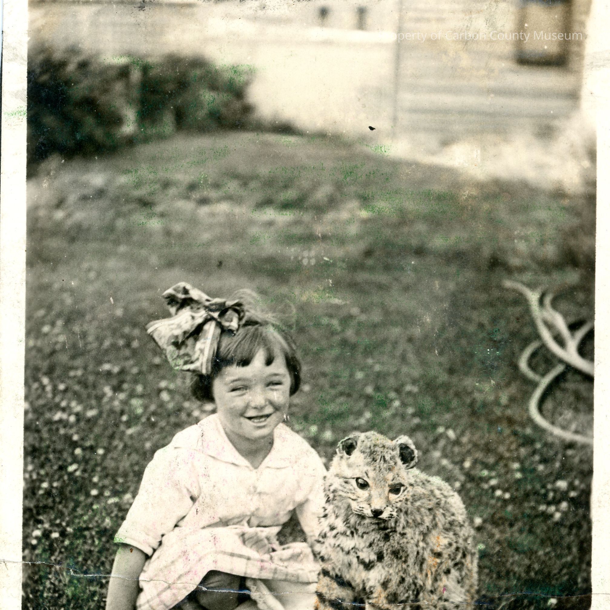 Black and white photograph. A young girl is sitting on a lawn beside a stuffed wildcat - possibly a bobcat or a lynx. Photograph is glued/pasted to a black backing. Typed on the back of the photograph is "Roberta Buchanan".