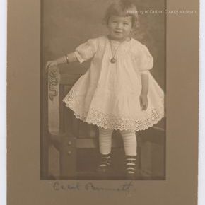 Photo of youngster. White dress with a long necklace on and standing on a stair. One copy Cecil Bennett Johnson.