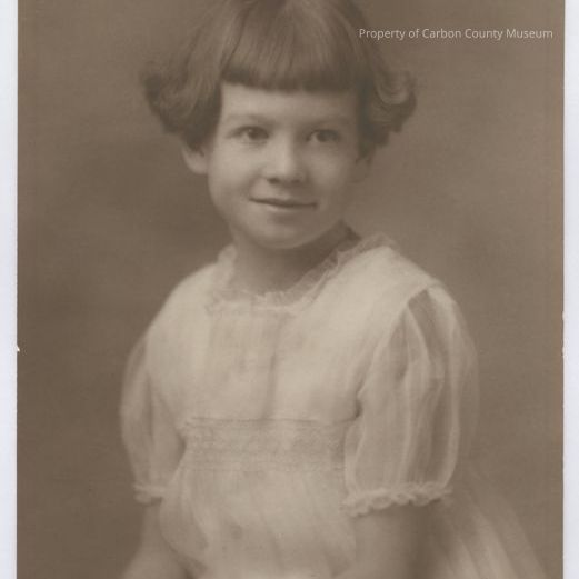 Photo of Cecil Bennett as a young girl, maybe 8y, in white dress with short puffy sleeves and two copies.