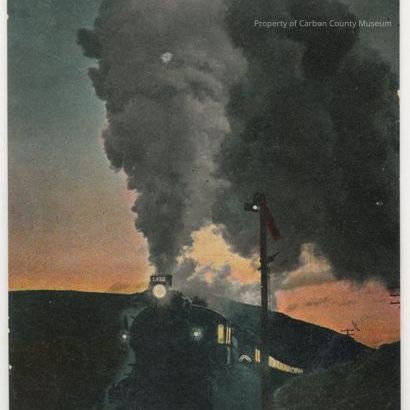Color print card of a train engine billowing smoke, followed by passenger cars with lights in the windows. An orange glow is above a hill in the background & a signal light on a pole is beside the train. The card is dark colors. Written upper left corner: "Night Work Ahead". In lower right corner in white: "400,901"