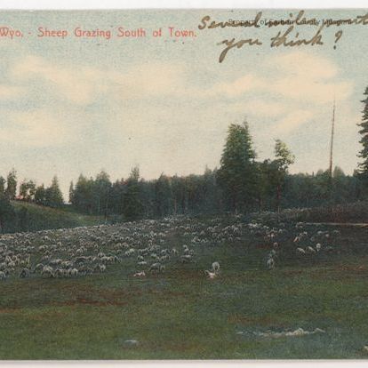 Update July 2011: Color card of sheep grazing on a grassy slope. Pine trees are on hills in the background in front of blue skies & fluffy clouds. Printed in red on top left: "Rawlins, Wyo. Sheep grazing South of Town" Written in black ink top right: "Several miles south don't you think?"
