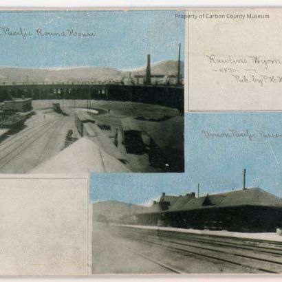 Color card of two prints on one card, top left is the Union Pacific Round House. Several train cars are in foreground, a curved building is opposite them & a circular shape is in the middle. Photo on right lower corner is of a depot with tracks in front. Printed on upper left: "Union Pacific Round House" On top right: "Rawlins, Wyoming - 1870 - Pub. by R. H. Healy" On bottom right: "Union Pacific Passenger Station.