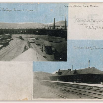 Color prints on postcard paper. Color card of two prints on one card, top left is the Union Pacific Round House. Several train cars are in foreground, a curved building is opposite them & a circular shape is in the middle. Photo on right lower corner is of a depot with tracks in front. Printed on upper left: "Union Pacific Round House" On top right: "Rawlins, Wyoming - 1870 - Pub. by R. H. Healy" On bottom right: "Union Pacific Passenger Station.