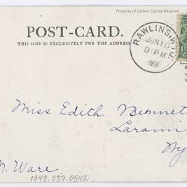 Printed on back in black: "POST-CARD" "This side is exclusively for the Address" Black circle Postmark:: "Rawlins, Wyo. June 16 9 PM 1906" Green stamp: "Series 1902 United States of America 1706 Franklin 1790 Postage One Cent" and a picture of Benjamin Franklin. Addressed to: "Miss Edith Bennett Laramie, Wyoming % S. N. Ware"