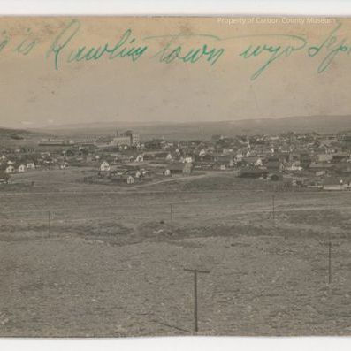 Update July 2011: Black & white print card of birds eye view of Rawlins, WY, looking east. the State Penitentiary, Catholic Church, & Central School can be seen. Houses, streets & business buildings are in photo center. Foreground is open land with sparse vegetation.