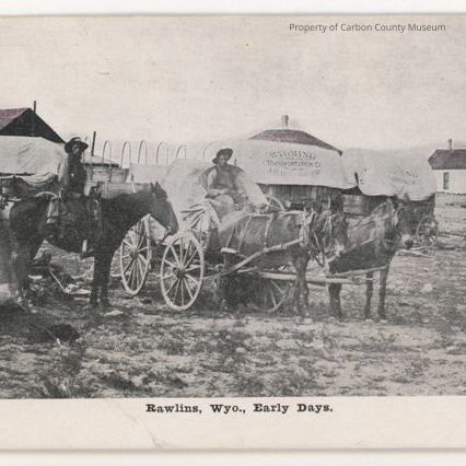 Update July 2011: Black & white print card of freight wagons, 2 mounted riders, a tent & some buildings in the distance. Printed on the canvas on the wagon: "Wyoming Transportation Co. Rawlins J W Hugus (unreadable)". One wagon has 2 mules harnessed to it & more set behind not hitched. Printed at bottom in black: "Rawlins, Wyo. Early Days."