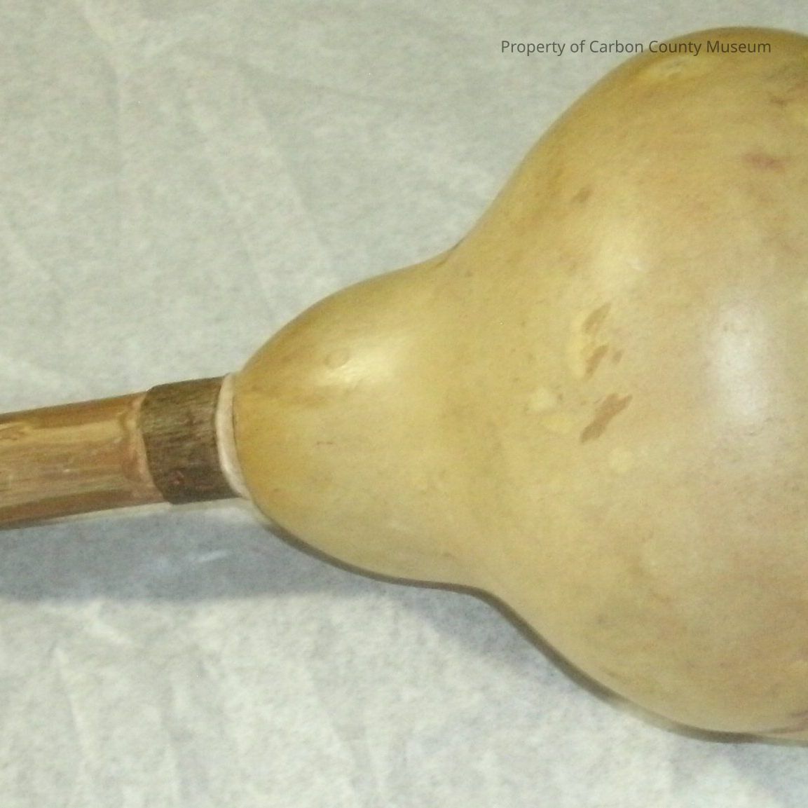 A 10" gourd rattle with wooden handle (measured from handle end to base of gourd) and brown/white 4.25" bird feather attached to yellowish/orange gourd end. Wooden handle measures 5" long and has string wristlet for handling. Donor state that it is Pueblo Indian in origin and that she purchased it in Las Vegas, N. M. in 1980's.Collection