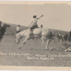 Black & white snapshot print on postcard paper. Image of a lady on the back of a bucking horse. Her left hand is on the reins & her right hand is in the air. Men on horseback are beside & in the background. The horse is light colored, has his head down & is jumping with his front feet outstretched & back ones with hooves off the ground kicking dirt into the air. Printed in white at bottom: "Marie Gibson on Grey Eagle, Winner Ladies Bronc Contest Rawlins Rodeo 24" "Meyers Photo"