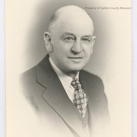 Update 2008: Black and white print. Studio portrait. Head and shoulders portrait of a man wearing a dark suit with vest, floral patterned tie, and white shirt. Close cropped hair, bald on top.