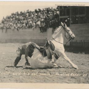 Black & white print card of a light colored mule & a man in a rodeo arena with a crowd in the grandstands. The mule is sitting on his butt with his front feet outstretched. The man is bent over behind the mule with his right hand near the ground & his left on the mule's side. The man wears a dark hat & medium jacket. Printed in white at bottom: "Ed Wright and his 25 cent Mule Rawlins Rodeo '24 Meyers Photo"