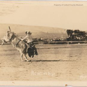 Sepia print card of a steer kicking up his back legs & a man is on his head. The man is between the horns of the steer with his left leg beside the steer's neck. The man has on a large brimmed hat, light colored shirt & chaps. Grandstands full of people are on photo right. A mounted cowboy is on photo right. Printed at bottom in white: "Rawlins, Wyo Meyers Photo 46"